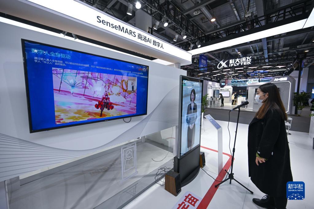 12月12日,參觀(guān)者在首屆全球數字貿易博覽會(huì )現場(chǎng)體驗數字人技術(shù)。數字人技術(shù)可以根據真人形態(tài)生成數字人,充當智能講解員、智能客服等。