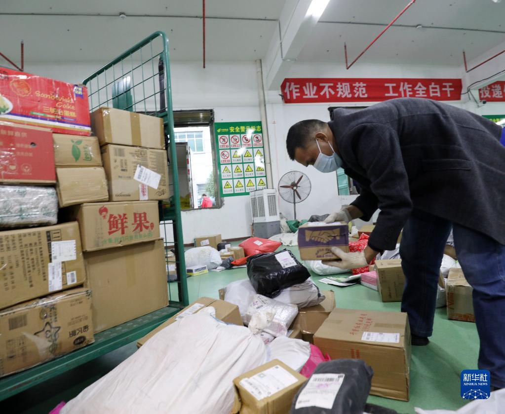 12月12日,在中國郵政集團公司湖南省資興市分公司郵件處理中心,工作人員分揀快遞包裹。