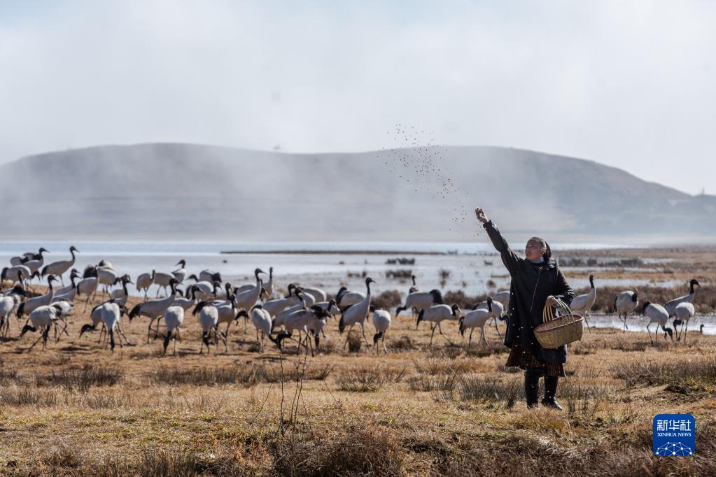 12月11日,陳光會(huì )在云南大山包黑頸鶴國家級自然保護區給黑頸鶴投食。