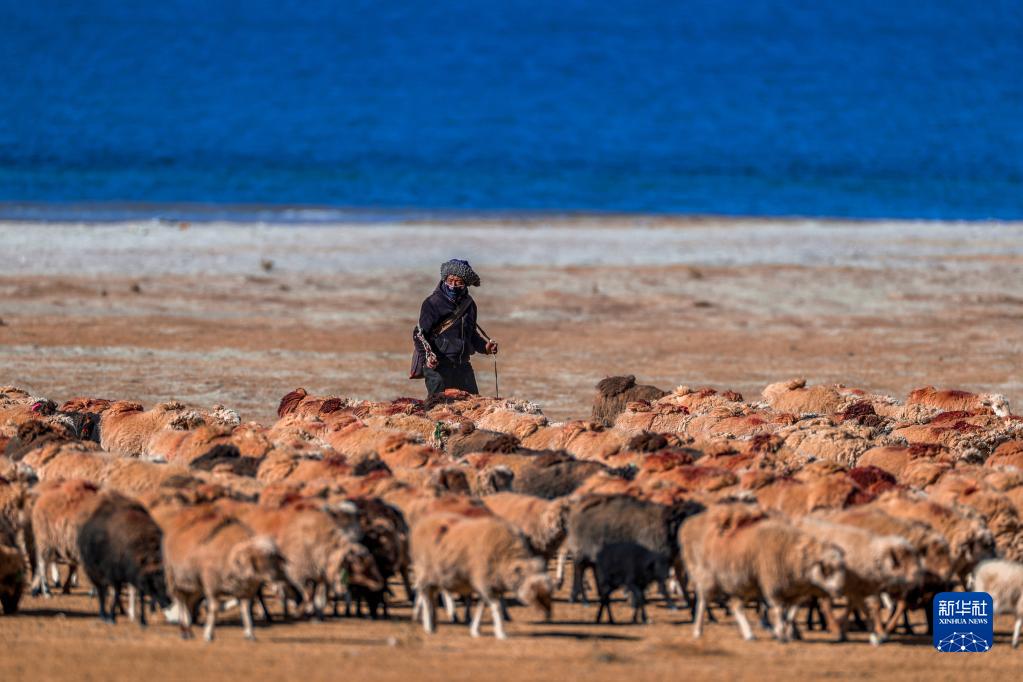牧民在羊卓雍錯湖邊放羊(12月11日攝)。