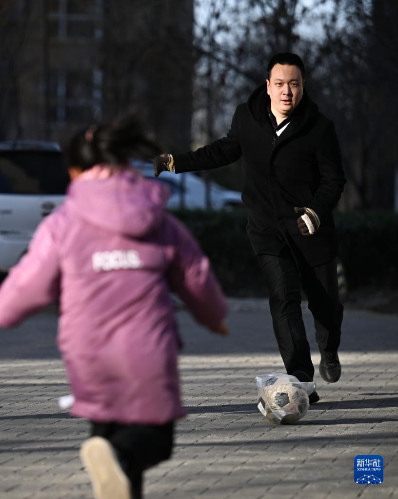 蔡成(右)與女兒在小區內踢足球,為了讓足球滾動(dòng)起來(lái)有聲音,足球被套上了塑料袋(12月1日攝)。