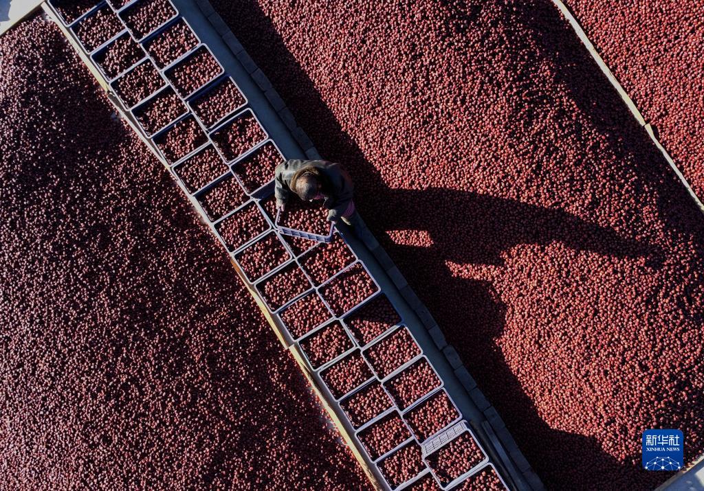 連日來(lái),河北省石家莊市行唐縣大棗種植戶(hù)利用晴好天氣對大棗進(jìn)行晾曬、篩選,供應市場(chǎng)。近年來(lái),行唐縣政府引導當地群眾利用丘陵和淺山區地帶種植優(yōu)質(zhì)大棗樹(shù),促進(jìn)農民增收。