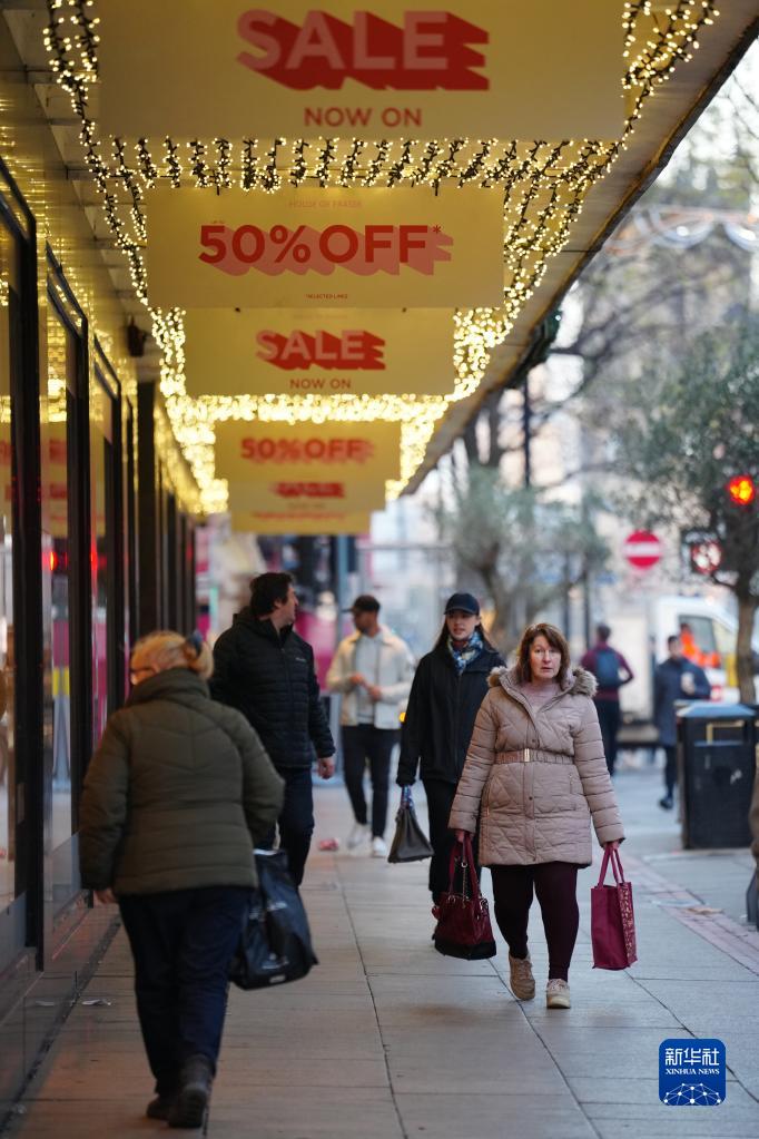 12月13日,人們走過(guò)英國曼徹斯特街上的促銷(xiāo)廣告。