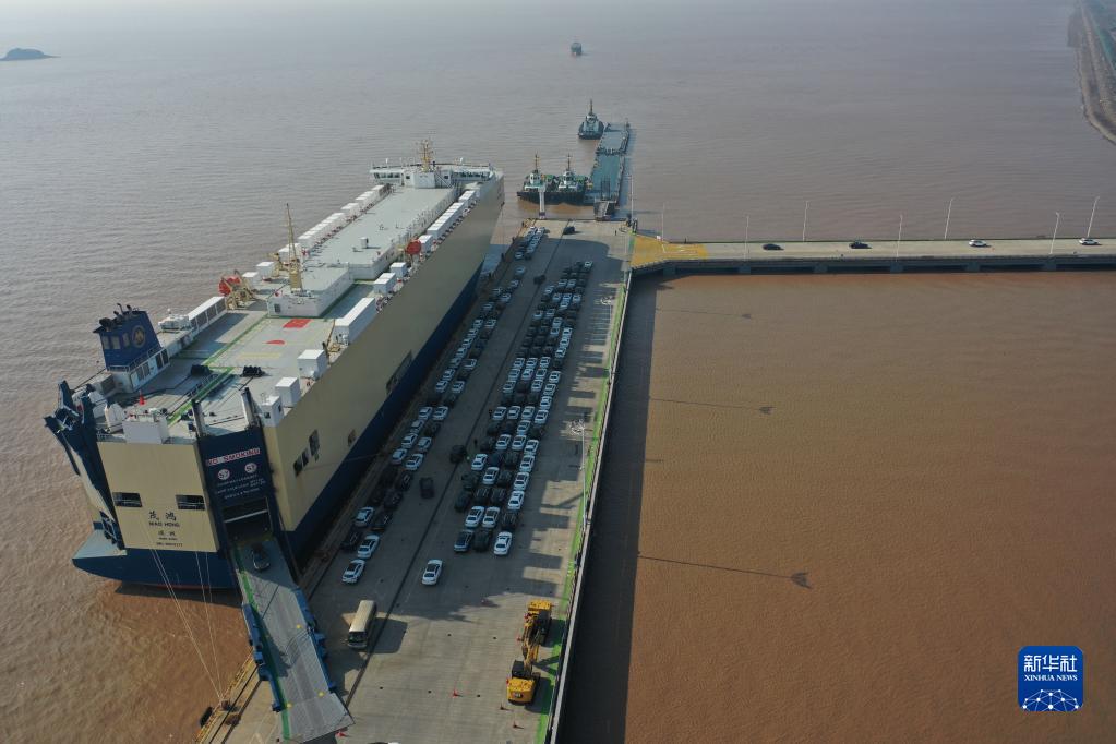 一艘滾裝船??吭谡憬瓕幉ㄖ凵礁勖窎|碼頭,裝運的汽車(chē)從船內駛出(12月13日攝,無(wú)人機照片)。