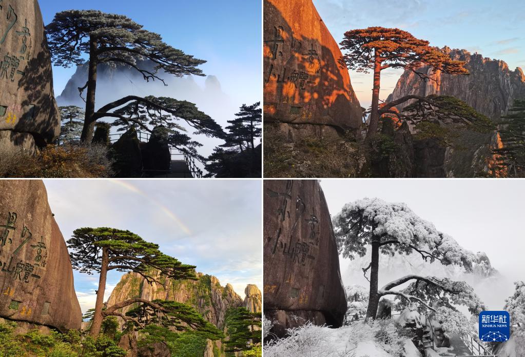 這是胡曉春拍攝的黃山迎客松(拼版照片,拍攝時(shí)間上左為2018年1月5日攝,上右為2020年10月13日攝,下左為2021年7月20日攝,下右為2022年2月18日攝)。