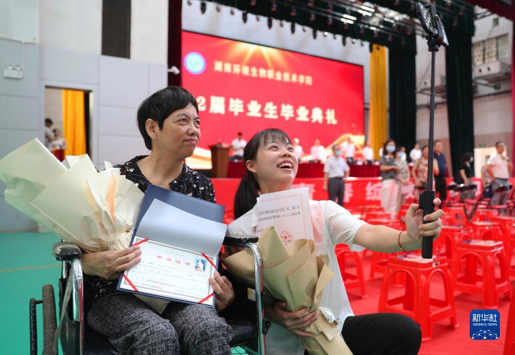 這是6月27日,在湖南省衡陽(yáng)市湖南省環(huán)境生物職業(yè)技術(shù)學(xué)院畢業(yè)典禮會(huì )場(chǎng),帶著(zhù)媽媽上大學(xué)的鄒晴在領(lǐng)到畢業(yè)證和湖南省優(yōu)秀畢業(yè)生證書(shū)后與媽媽自拍合影留念。
