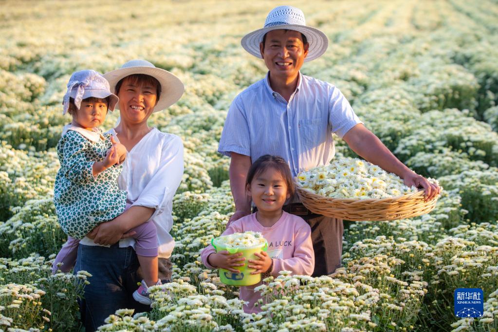 這是9月21日,在山東省淄博市高青縣黑里寨鎮黑二村,種植中藥材的“70后”家庭農場(chǎng)主張新廣(右一)和家人在菊花田間合影留念。