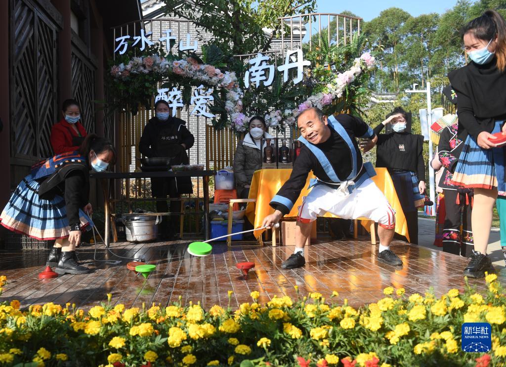 12月15日,表演人員在廣西河池園博園給游客展示打陀螺。