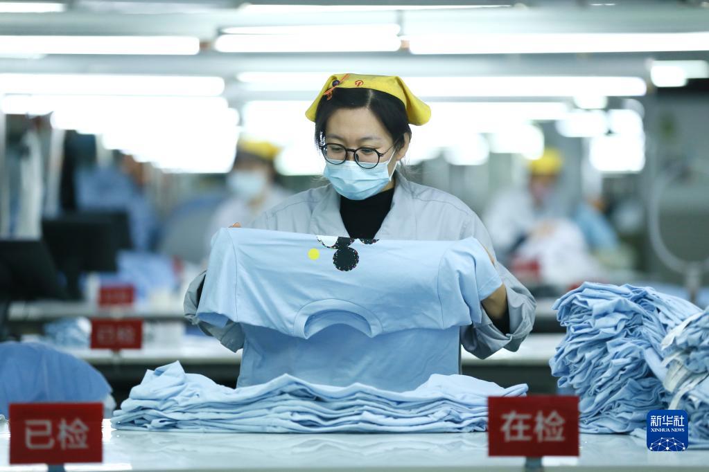 12月16日,青島市即墨區一家服裝企業(yè)的工人在檢驗準備出口到海外市場(chǎng)的產(chǎn)品。