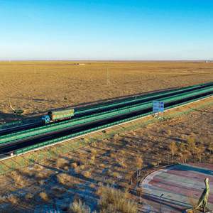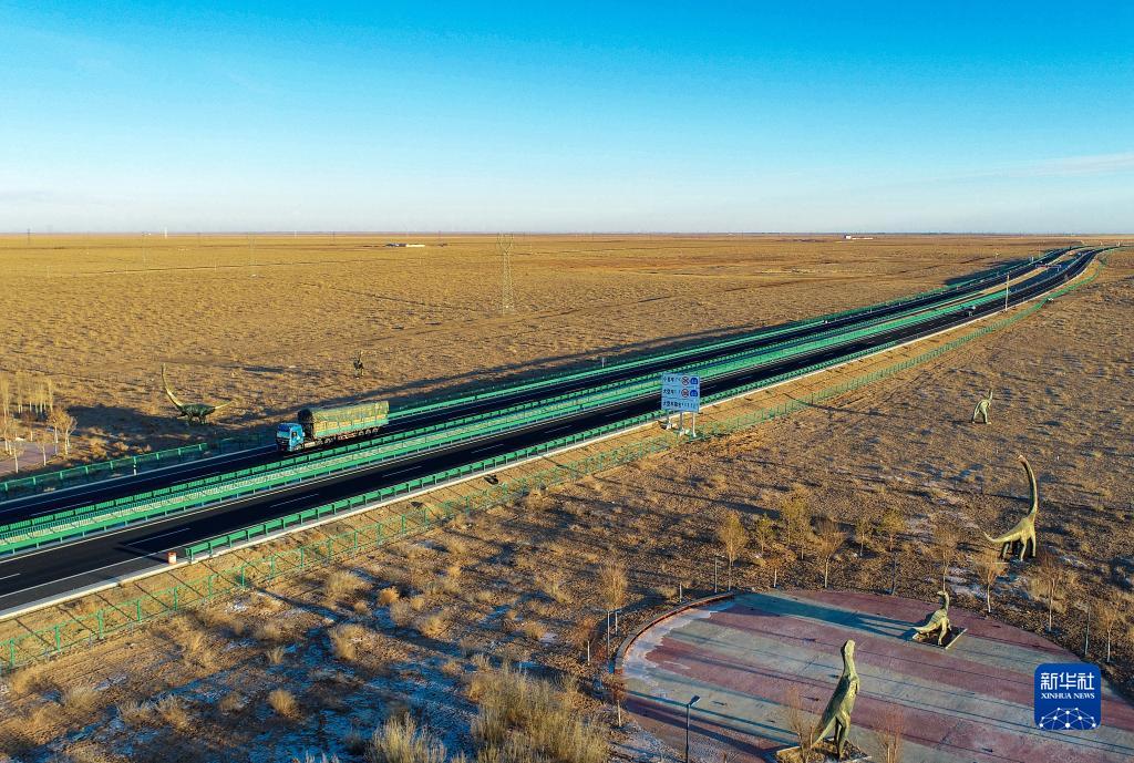 12月16日,車(chē)輛在二廣高速內蒙古二連浩特至賽漢塔拉段上行駛(無(wú)人機照片)。