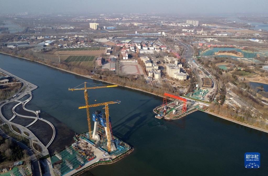 12月15日,工人在石家莊市太平河片區工程學(xué)府路東延跨太平河大橋建設工地施工(無(wú)人機照片)。