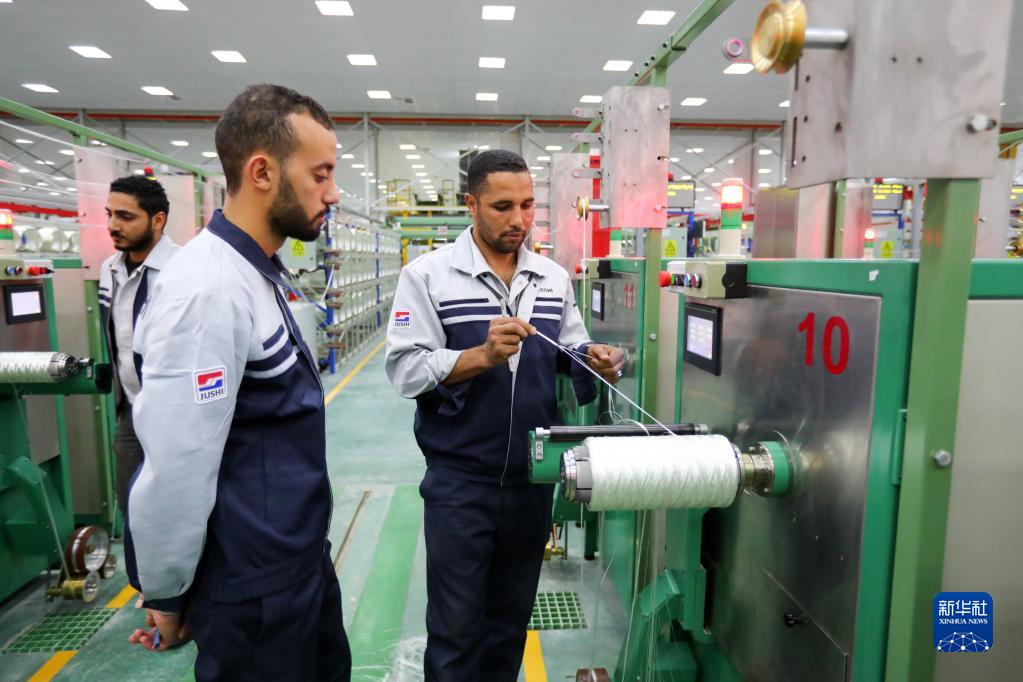 12月15日,在位于埃及蘇伊士省的中國巨石埃及玻璃纖維股份有限公司(巨石埃及公司),工人在玻璃纖維生產(chǎn)線(xiàn)上工作。