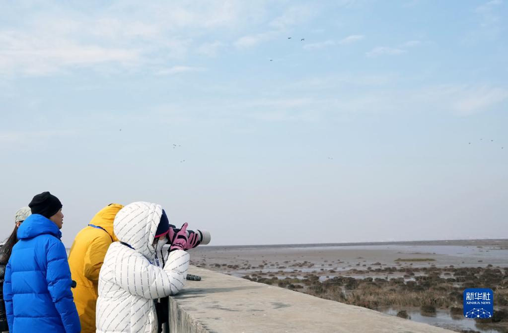 12月17日,在上海崇明東灘自然保護區,濱海社區觀(guān)鳥(niǎo)邀請賽的參賽者在觀(guān)鳥(niǎo)。