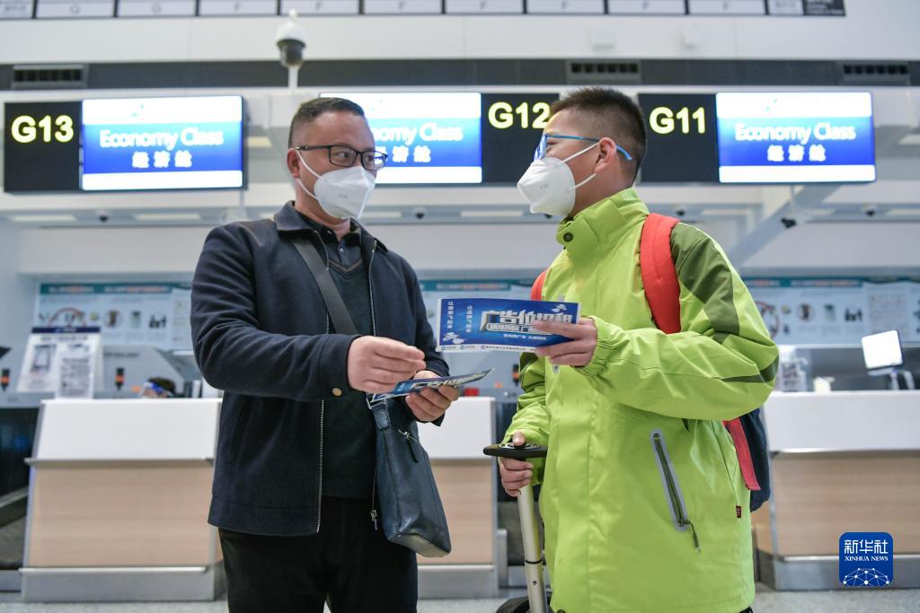 在貴陽(yáng)龍洞堡國際機場(chǎng),金粲璨與父親在登機前核對登機牌(12月14日攝)。