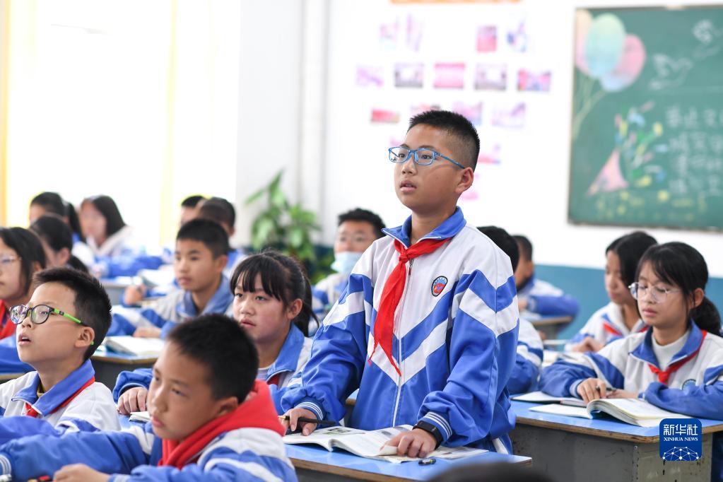 在貴州省丹寨縣城關(guān)第一小學(xué),金粲璨起立回答課堂提問(wèn)(11月15日攝).