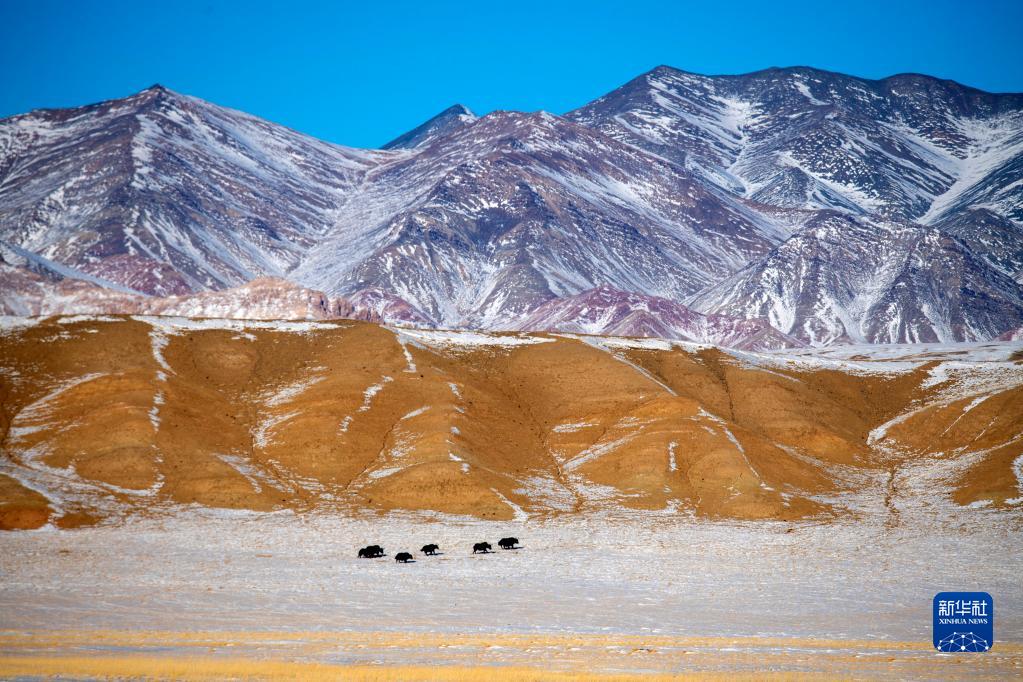 一場(chǎng)降雪過(guò)后,地處甘肅省酒泉市阿克塞哈薩克族自治縣境內的哈爾騰高原被皚皚白雪覆蓋,成群的藏野驢、野牦牛等野生動(dòng)物在高山雪地間戲雪覓食,為冬日的哈爾騰增添了不少生機與活力。