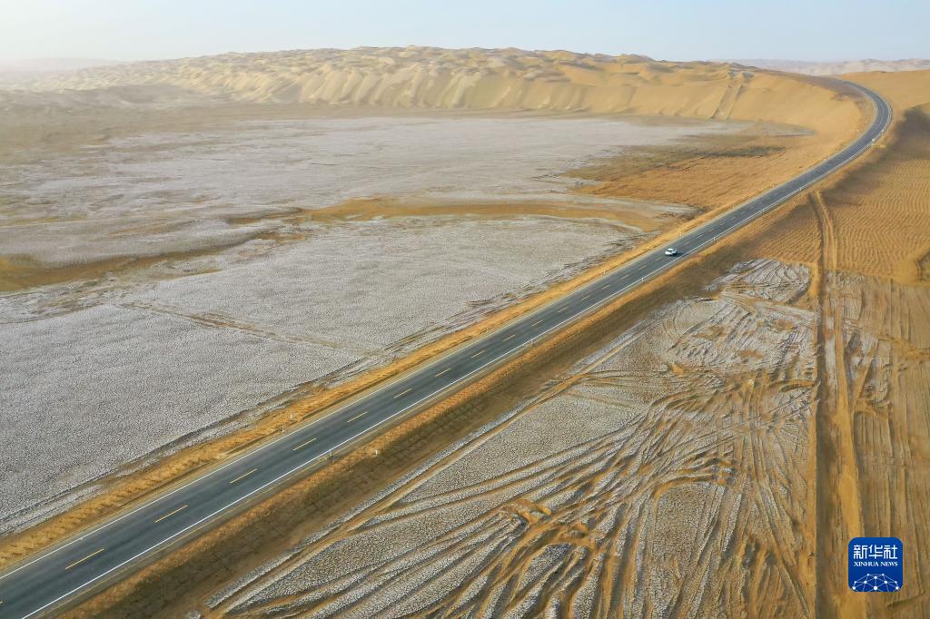 工作車(chē)輛在新疆尉犁至且末沙漠公路上行駛(2022年6月26日攝,無(wú)人機照片)。2022年6月30日,尉犁至且末沙漠公路正式通車(chē),成為我國建成的第三條穿越“死亡之?!彼死敻缮衬慕煌ㄒ?。
