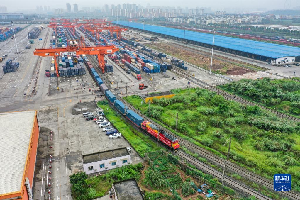 中歐班列(重慶)第10000列列車(chē)在重慶團結村中心站順利駛出(2022年6月23日攝,無(wú)人機照片)。