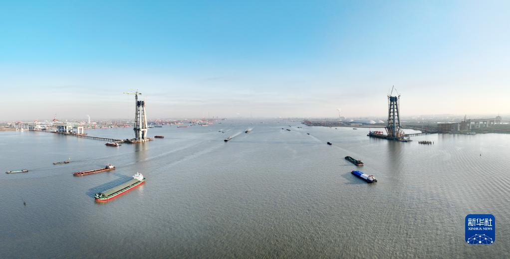 12月19日,常泰長(cháng)江大橋主塔施工如火如荼(無(wú)人機照片)。