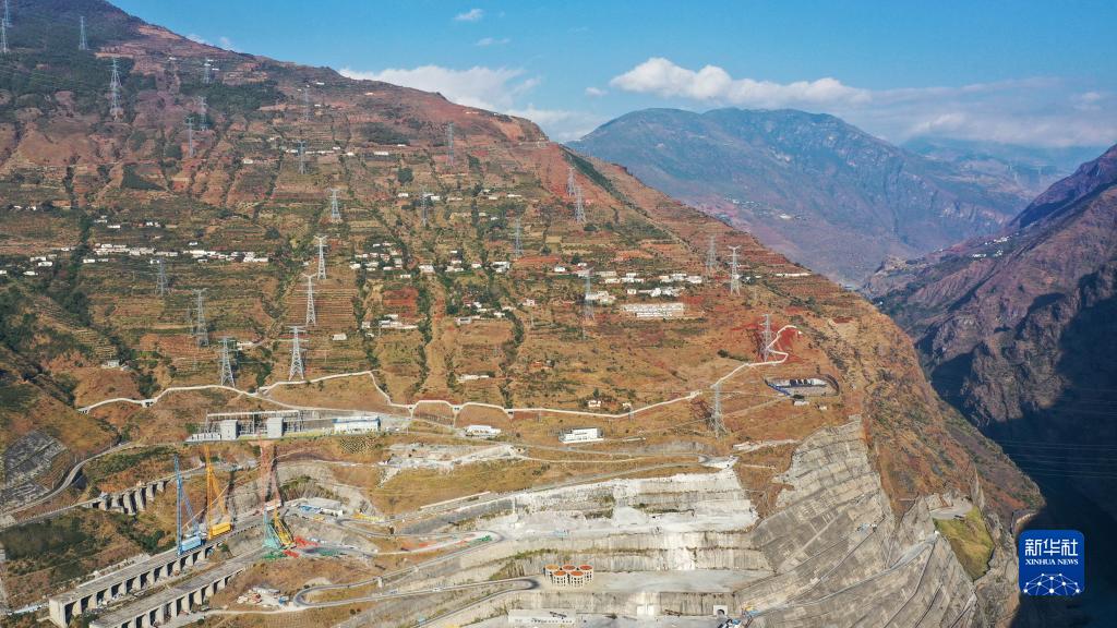 這是11月24日拍攝的位于白鶴灘水電站的超高壓輸電線(xiàn)路(無(wú)人機照片)。