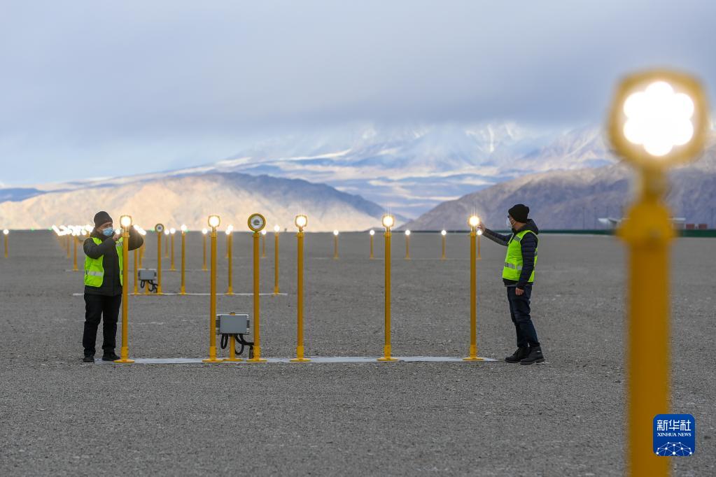 12月19日,在塔什庫爾干紅其拉甫機場(chǎng),工作人員檢查助航燈光系統。