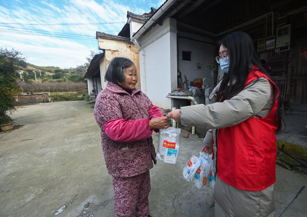 12月20日,愛(ài)心志愿團的志愿者給諸暨市東白湖鎮廖宅村的老人送愛(ài)心防疫包。