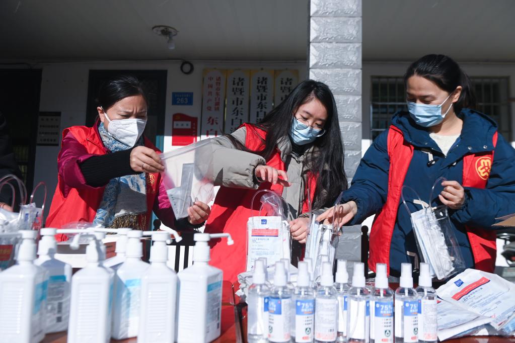 12月20日,在諸暨市東白湖鎮東白山村村委會(huì ),愛(ài)心志愿團的志愿者們分裝愛(ài)心防疫包,愛(ài)心防疫包里有愛(ài)心人士捐贈的抗原檢測試劑、消毒液、口罩、防疫指南等。