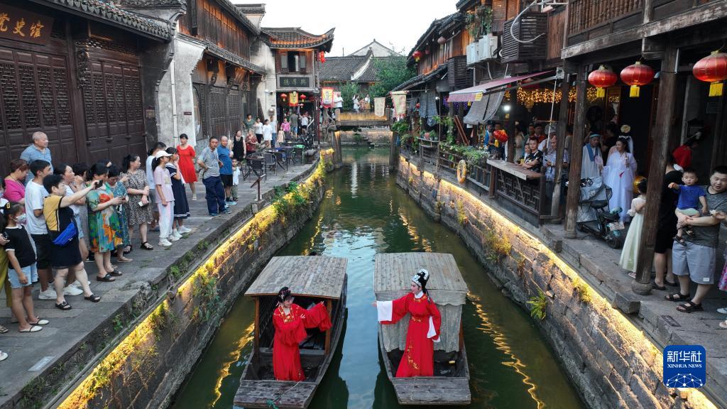 7月10日,浙江省湖州市德清縣新市古鎮“戲曲夜市”上,演員為群眾表演傳統戲曲曲目(無(wú)人機照片)。