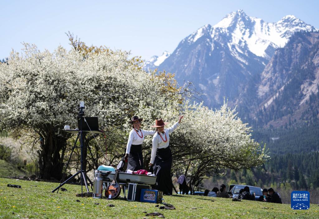 4月25日,四川省九寨溝縣漳扎鎮中查溝村民在草甸上直播。