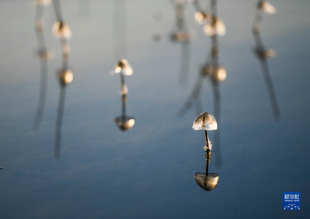 12月16日,河北省遵化市侯家寨鄉般若湖面水草結冰。