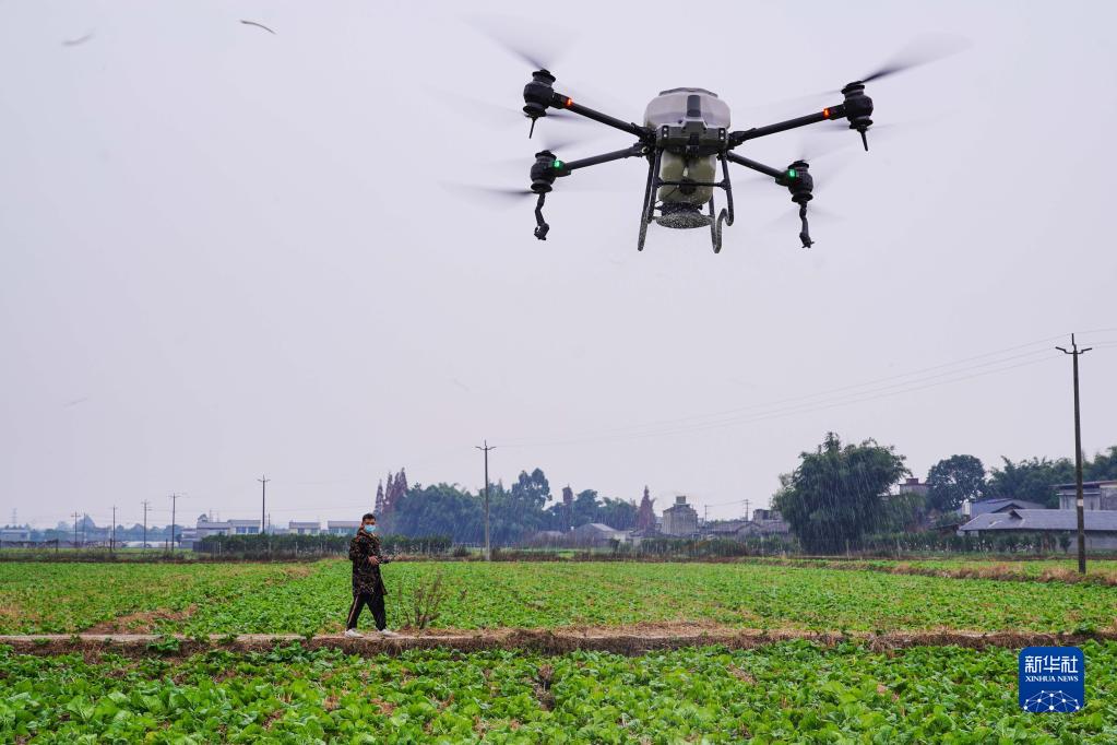 12月19日,在四川省眉山市彭山區公義鎮欣榮村四組,專(zhuān)業(yè)無(wú)人機飛手羅凱操作無(wú)人機為青菜噴施肥料。