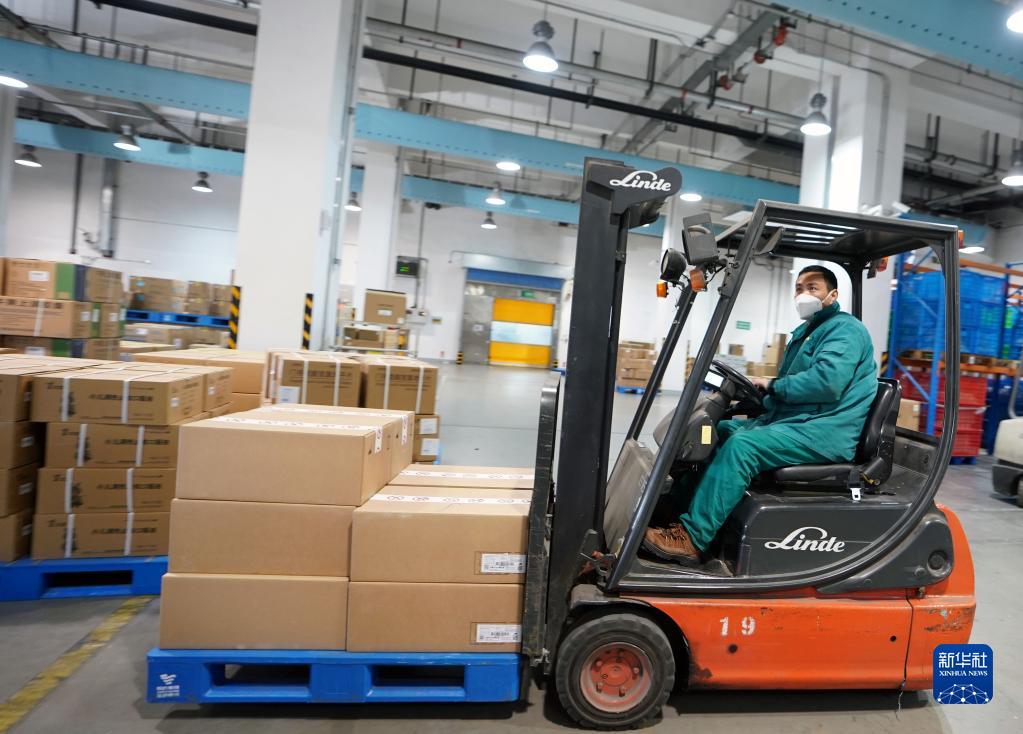 12月20日,工作人員開(kāi)著(zhù)叉車(chē)在國藥物流上海物流中心2號倉庫搬運藥品。