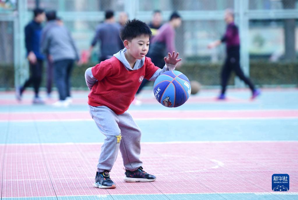 12月21日,一名兒童在石家莊市體育公園練習籃球。