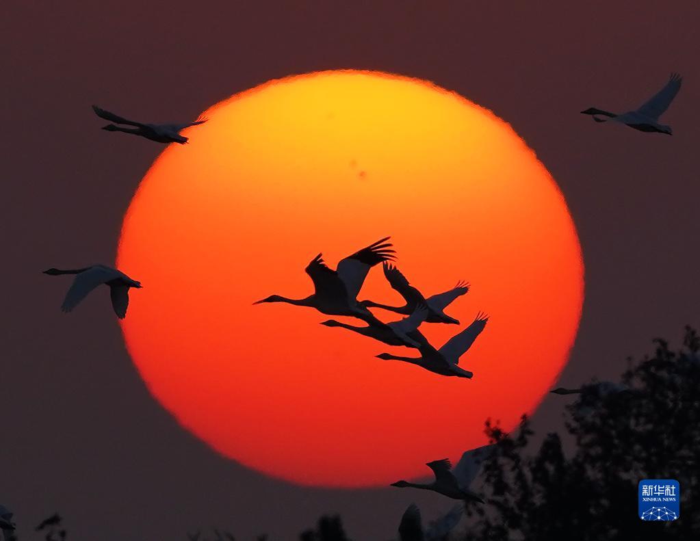 候鳥(niǎo)在南昌高新區五星白鶴保護小區上空飛翔(12月21日攝)。