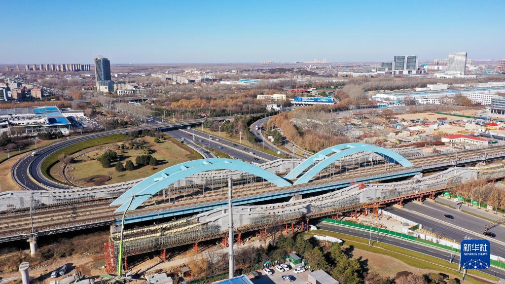 12月22日,中鐵十局的工作人員在對濟鄭高鐵跨濟南經(jīng)十西路槽型梁進(jìn)行合龍作業(yè)(無(wú)人機照片)。