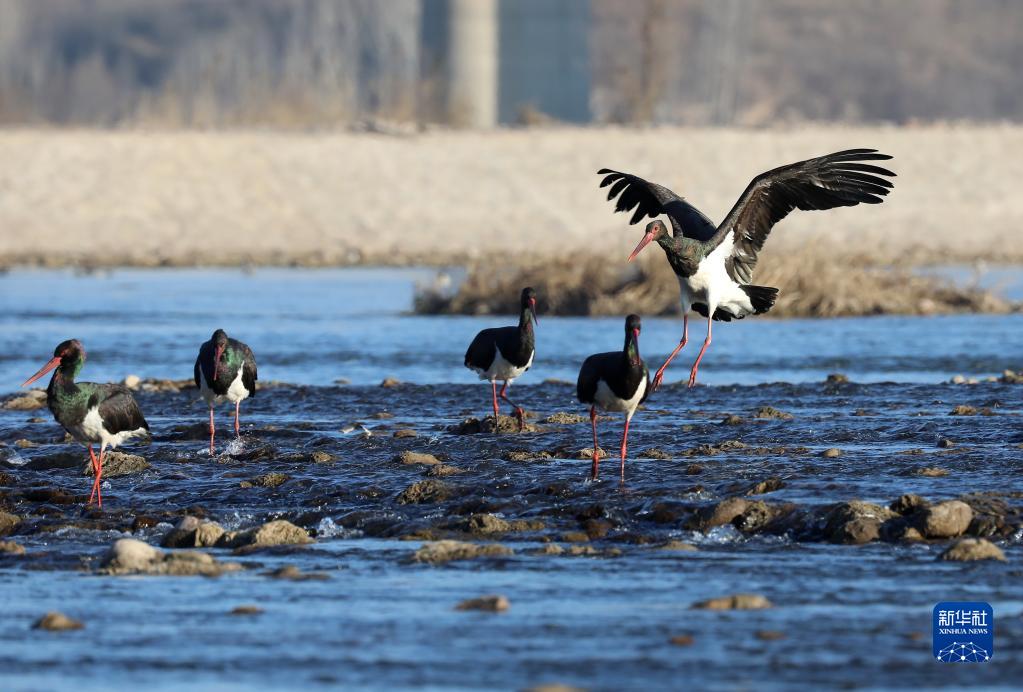 12月22日,一群黑鸛在河北省井陘縣境內的綿蔓河嬉戲。