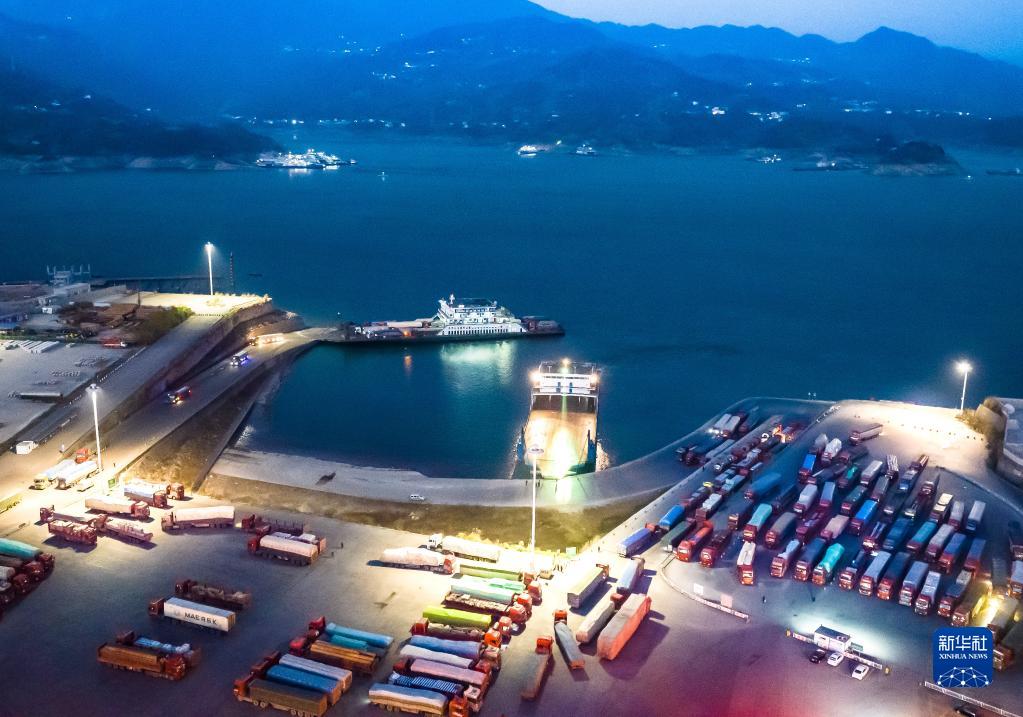 12月21日晚,大型貨車(chē)在三峽大壩上游湖北省宜昌市秭歸縣銀杏沱滾裝碼頭上、下船(無(wú)人機照片)。