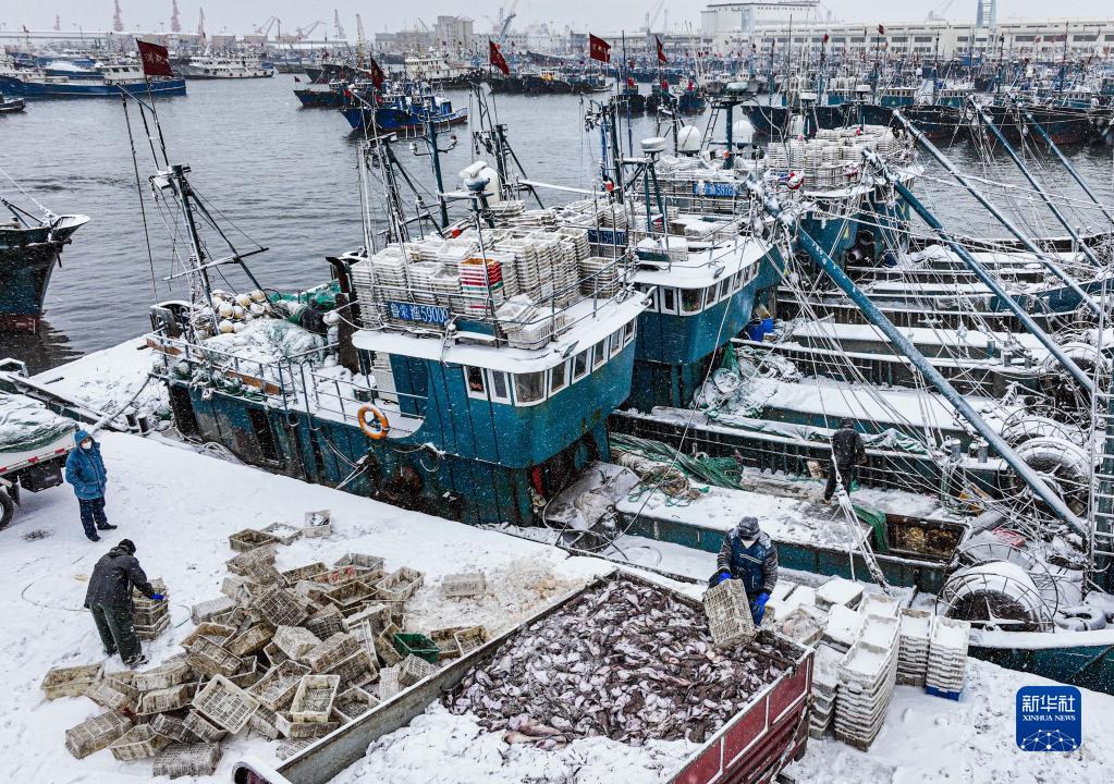 12月22日,在山東省榮成市石島管理區石島漁港,漁民在卸漁獲(無(wú)人機照片)。