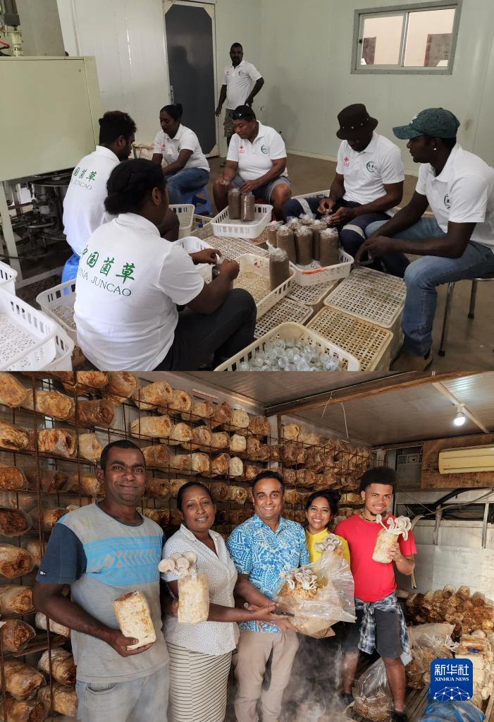下圖:2022年5月11日,在斐濟楠迪市,一家斐濟蘑菇公司員工展示在中國援斐菌草技術(shù)示范中心項目幫助下種植的蘑菇。新華社記者 張永興 攝
