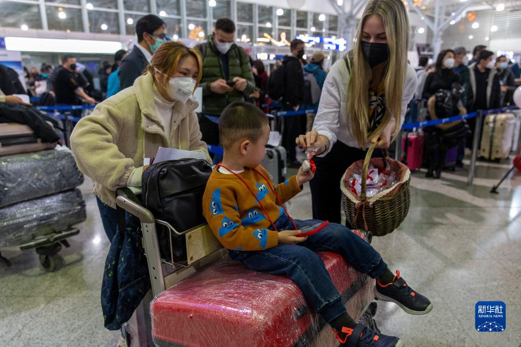 12月22日,在希臘雅典國際機場(chǎng),機場(chǎng)工作人員向旅客派送甜點(diǎn)禮物。