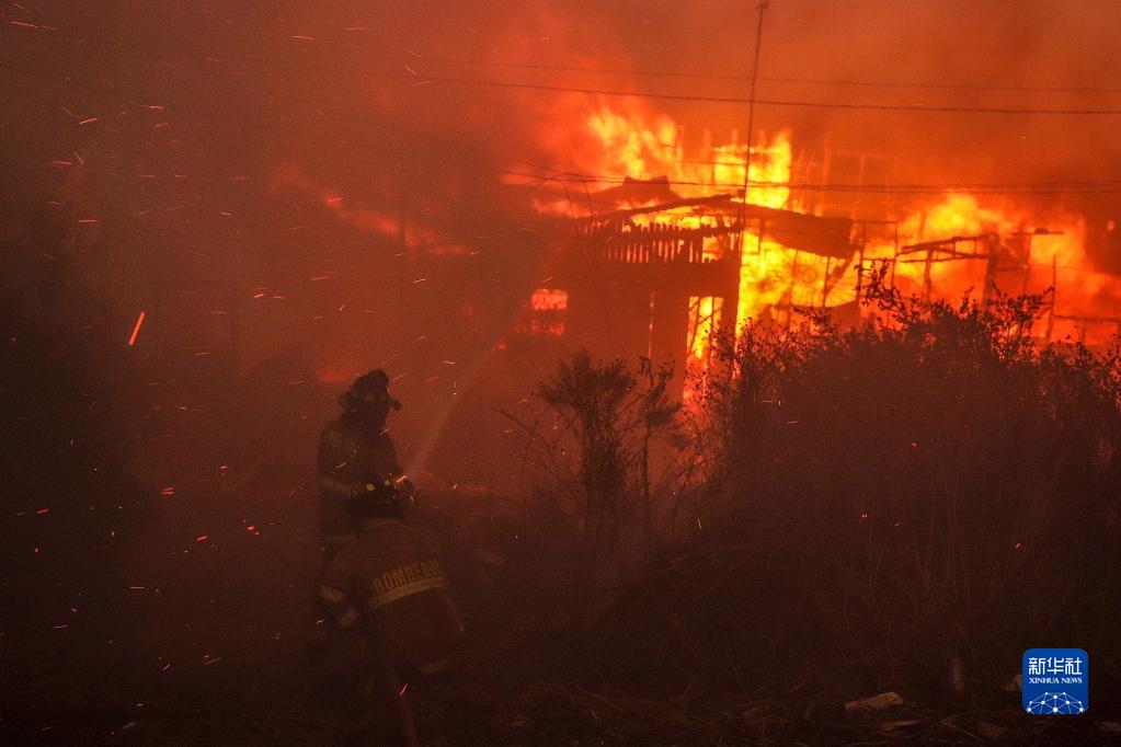 12月22日,在智利海濱城市比尼亞德?tīng)栺R,消防員在森林火災現場(chǎng)進(jìn)行滅火作業(yè)。