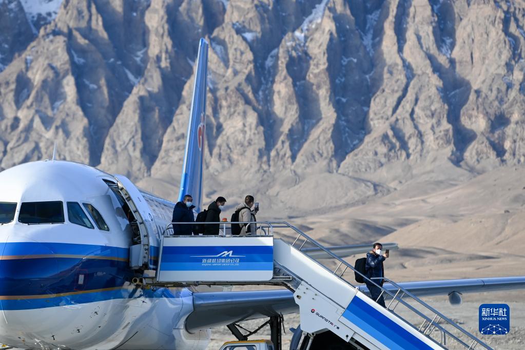 12月23日,在塔什庫爾干紅其拉甫機場(chǎng),乘坐首航航班的旅客走下飛機。