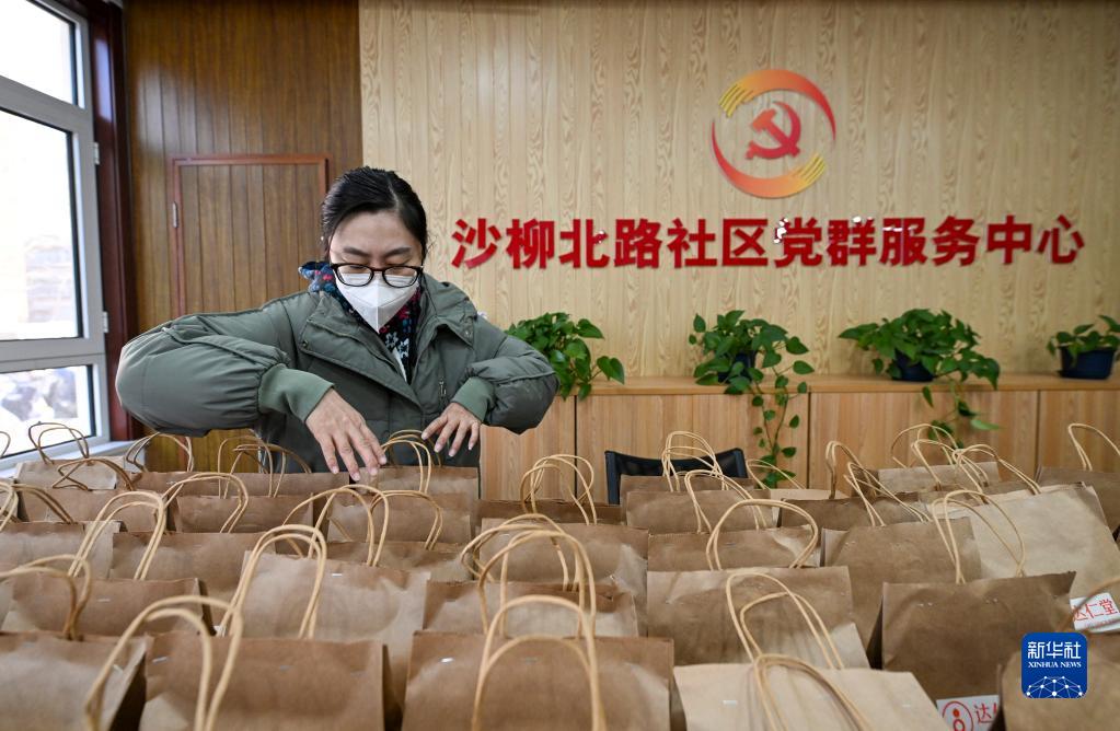 12月23日,在天津市河東區東新街道沙柳北路社區黨群服務(wù)中心,工作人員在盤(pán)點(diǎn)“健康防疫包”物資數量。