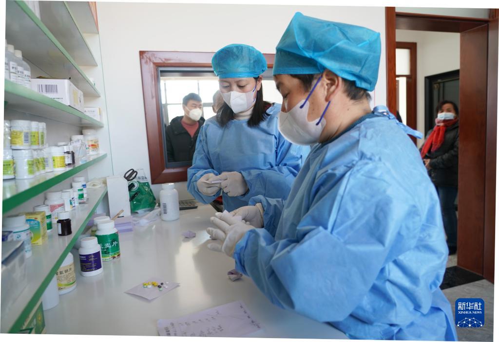 12月22日,在周至縣馬召鎮富饒村東富饒衛生室內,工作人員在為發(fā)熱患者包裝藥品。