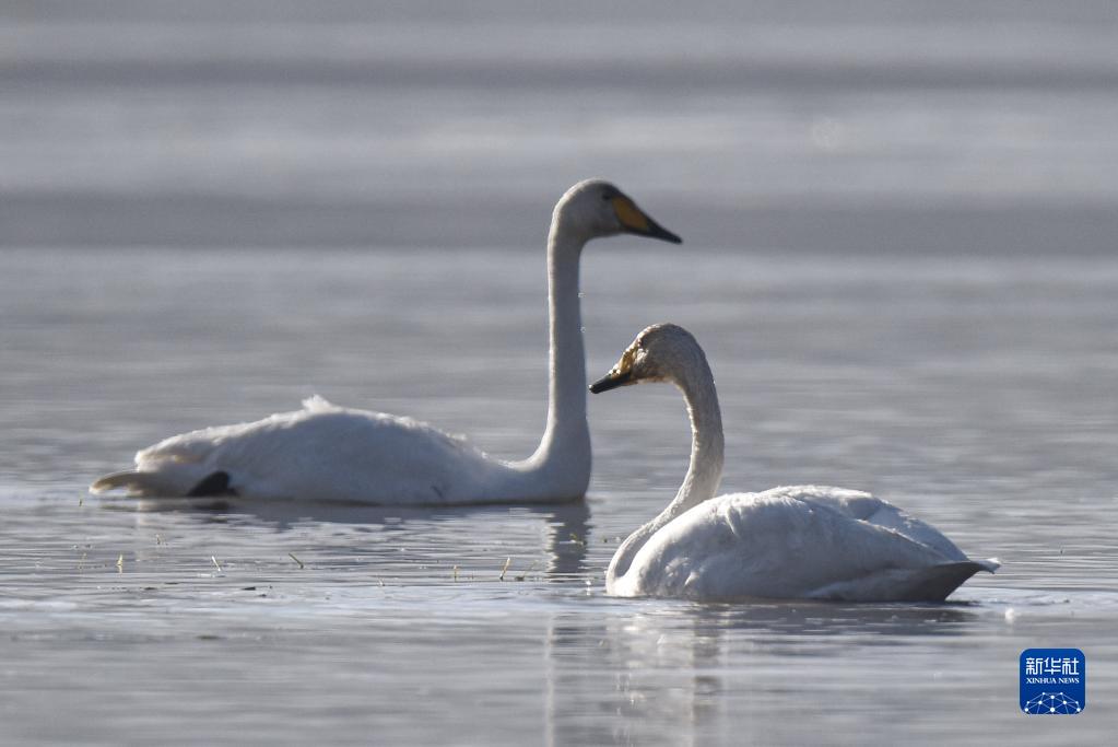 12月23日,大天鵝在青海省化隆回族自治縣群科鎮的黃河水面上休憩覓食。