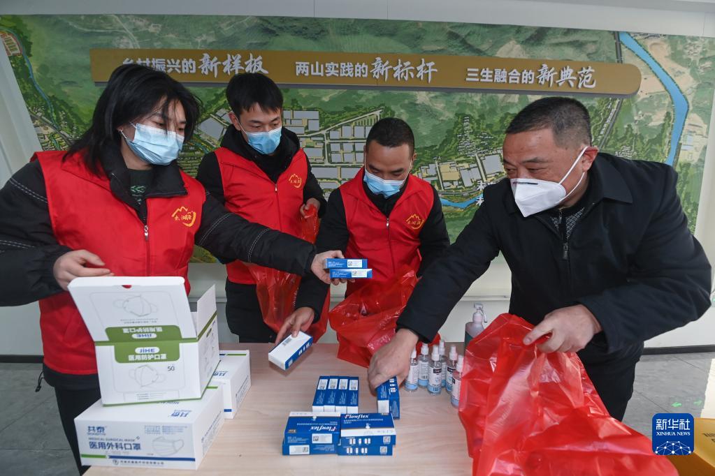 12月23日,在杭州市臨安區太湖源鎮黨群服務(wù)中心,村社醫療小分隊的志愿者們在分裝健康禮包,健康禮包里有消毒液、口罩、必備藥品等。