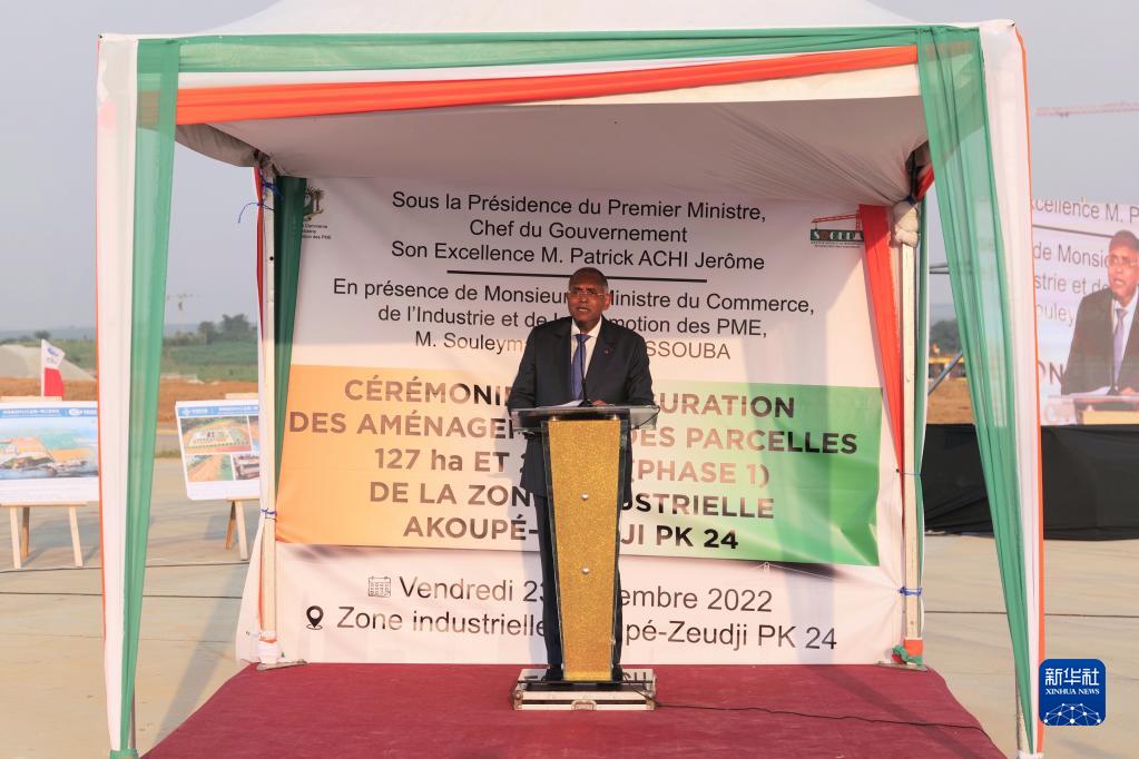 12月23日,在科特迪瓦阿比讓市西北部,科特迪瓦總理帕特里克·阿希在PK24工業(yè)園一期項目竣工儀式上致辭。