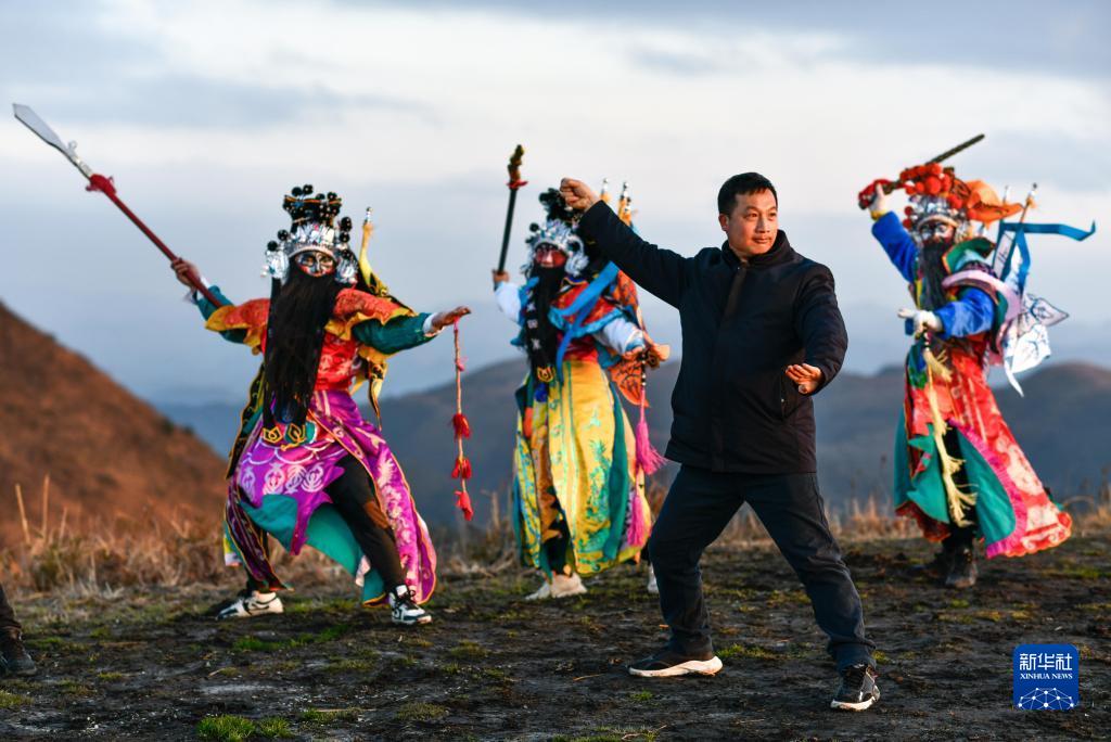 2022年2月7日,在貴州省黔南布依族苗族自治州龍里縣龍山鎮,“龍里太平花燈”藝人劉江(前)在村附近的山頂上指導年輕人練習花燈戲?!褒埨锾交簟笔橇鱾饔谫F州省龍里縣龍山鎮的一種古老戲曲劇種,在當地政府的保護與支持下,已傳承發(fā)展出“生旦凈丑”劇唱、臺上臺下互動(dòng)表演等多種表演形式。