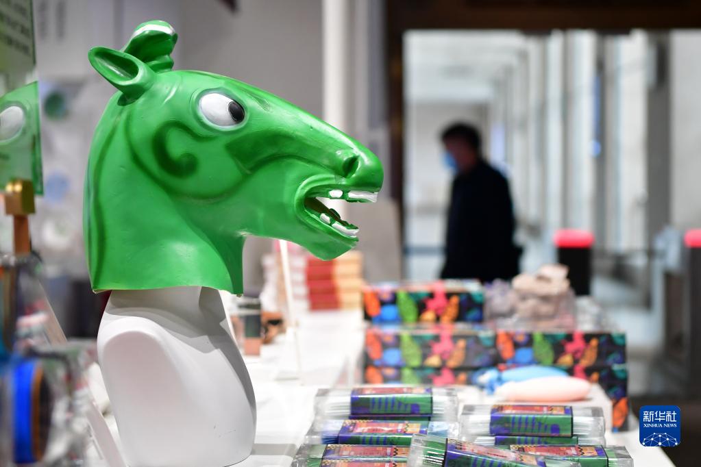 2022年5月13日,在位于蘭州的甘肅省博物館文創(chuàng )商店內,以銅奔馬和抗擊疫情為主題設計的“綠馬頭套”十分搶眼。銅奔馬又稱(chēng)“馬踏飛燕”,是甘肅省博物館的“鎮館之寶”。近年來(lái),甘肅省博物館推出以銅奔馬為主題的系列文創(chuàng )產(chǎn)品,讓文物走進(jìn)生活,受到人們喜愛(ài)。