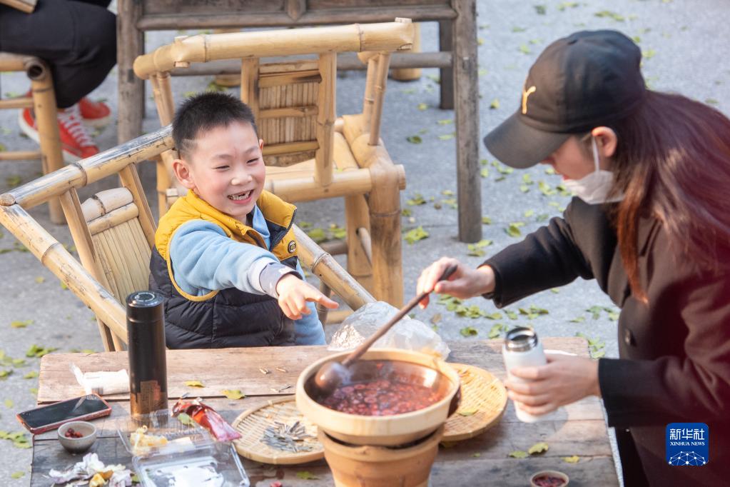 12月24日,在位于重慶解放碑商圈的著(zhù)名景點(diǎn)山城巷的一家店內,游客品嘗特色餐飲。